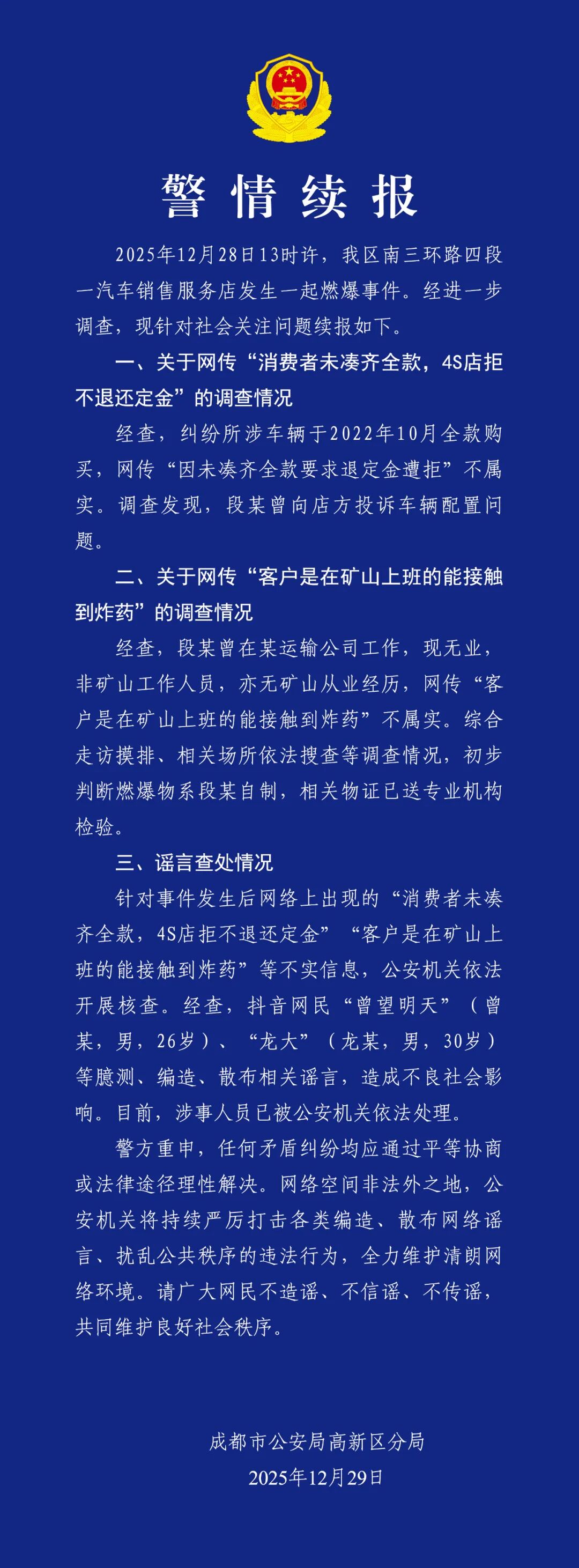 2025年12月28日13时许,我区南三环路四段一汽车销售劳动店发生统共燃爆事件。经进一方式查,现针对社会热心问题续报如下。